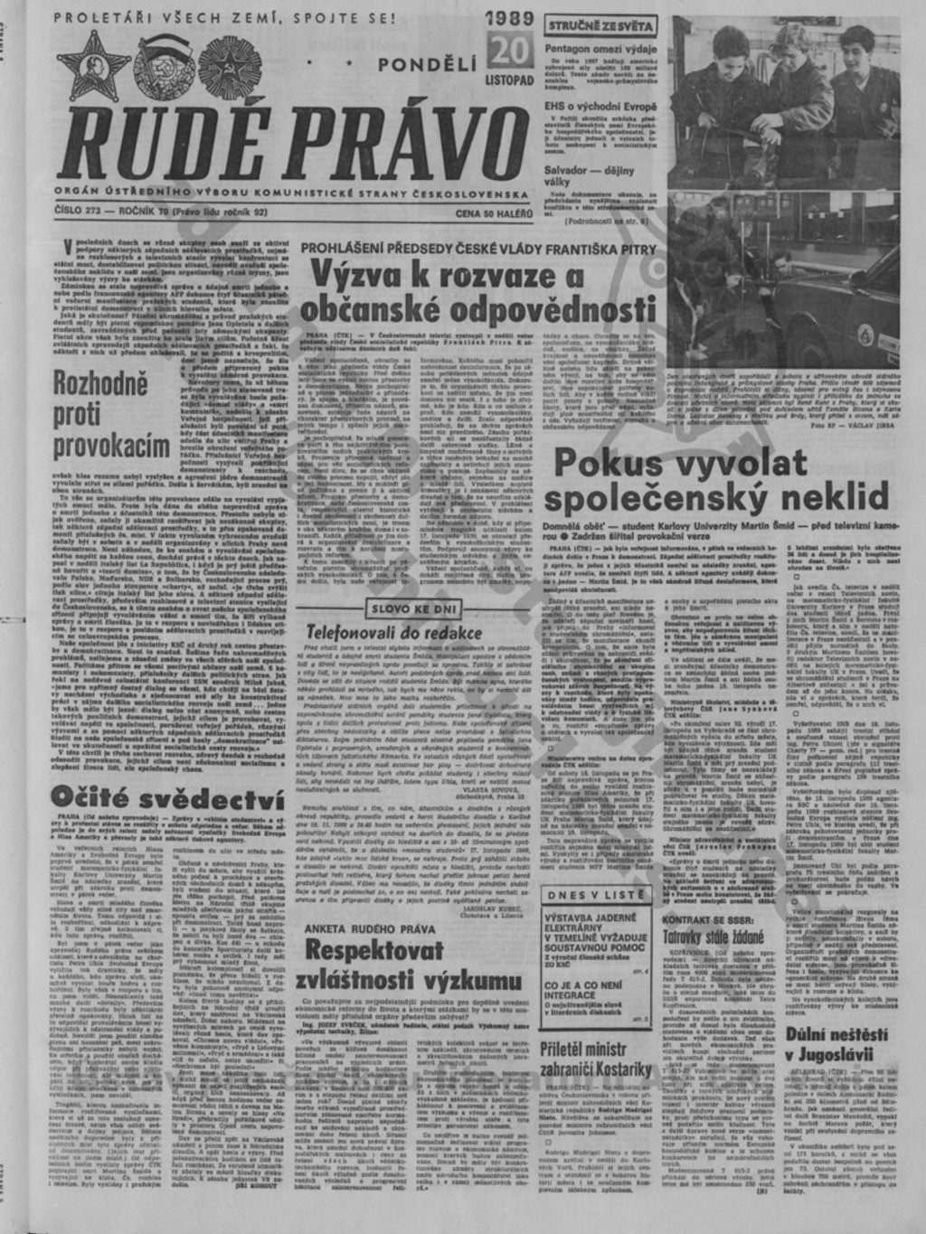 Denník mal výsadné postavenie. Cenzuroval a interpretoval spravodajstvo v súlade s ideologickou líniou KSČ, čoho dôkazom sú aj titulné strany v období demonštrácií proti komunizmu. Prvé informácie o protestoch zverejnili až po 20. novembri. Napríklad článok s titulkom „Obnoviť poriadok, chrániť majetok a životy občanov" hovorí za všetko.