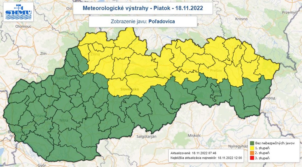 Poľadovica sa môže vyskytovať v okresoch Banskobystrického, Košického, Prešovského a Žilinského kraja. Výstraha je predbežne platná do soboty (19. 11.) 9.00 h.