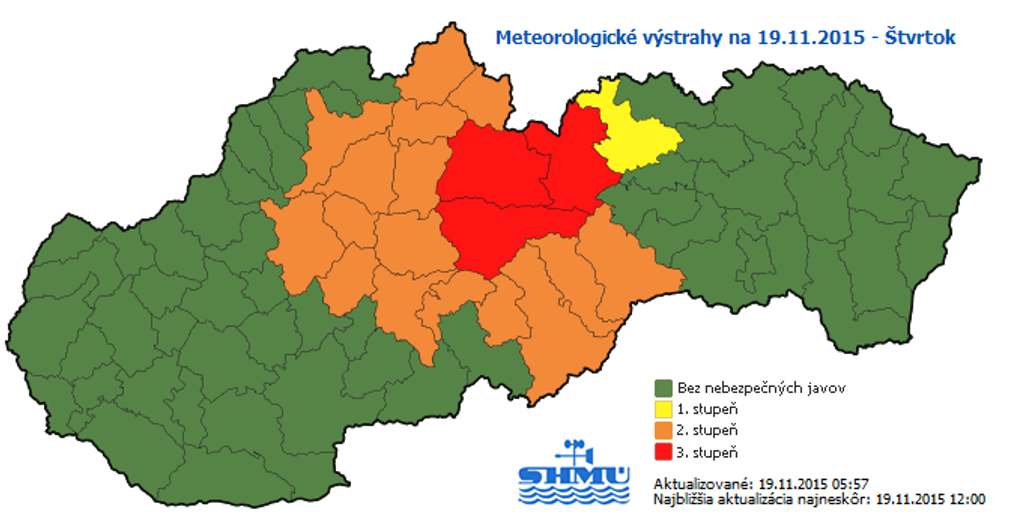 Výstraha 3. stupňa platí na dnešné dopoludnie do 12.00 h pre okresy Liptovský Mikuláš, Poprad a Brezno.