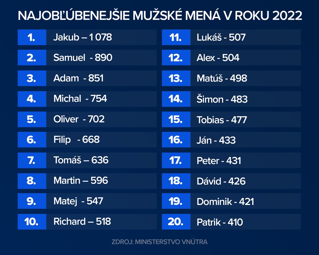 Naopak, najpoužívanejšie chlapčenské meno zostáva v porovnaní s minulým, ale i predminulým rokom rovnaké. Jakub kraľuje pred Samuelom a Adamom. Nasleduje Michal, Oliver, Filip, Tomáš a Matej.