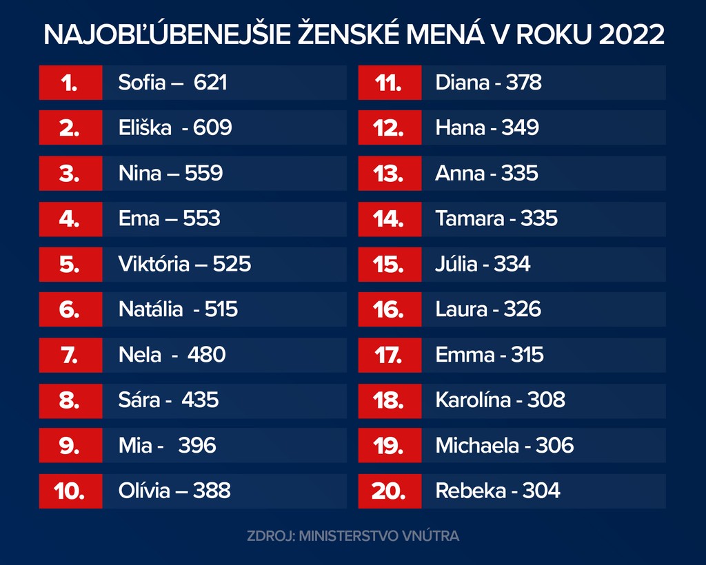 „V roku 2020 patrilo prvenstvo ženskému menu Ema, v roku 2021 ženskému menu Nina a v roku 2022 má prvenstvo ženské meno Sofia,“ uvádza rezort vnútra. Sofia vlani skončila na treťom mieste.