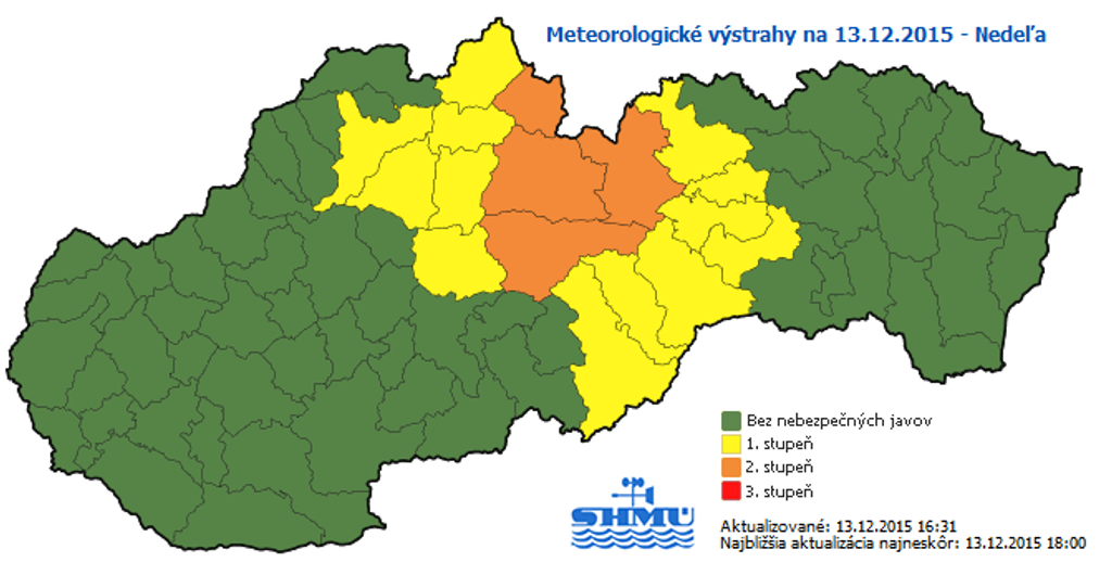 Prvý stupeň výstrahy platí pre okresy Námestovo, Žilina, Martin, Ružomberok, Dolný Kubín, Banská Bystrica, Rimavská Sobota, Revúca, Rožňava, Spišská Nová Ves, Levoča a Kežmarok.