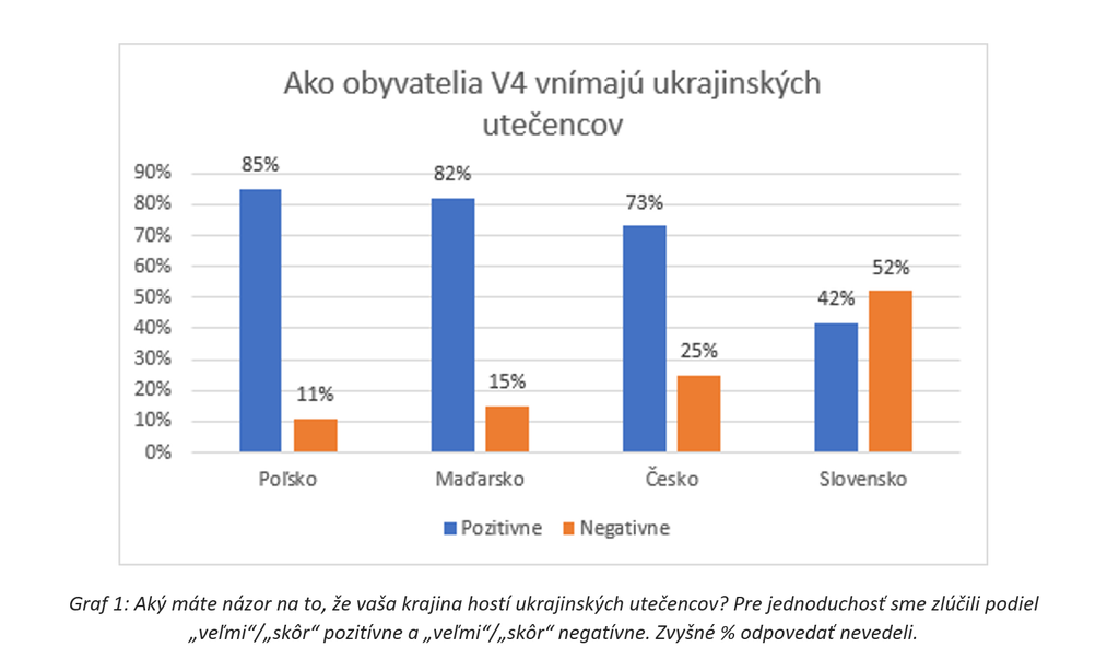 „Slovensko je teda jediná krajina v našom regióne, ktorej ani polovica populácie nevníma ukrajinských utečencov pozitívne,“ konštatuje GLOBSEC. Najviac ľudí ich vníma pozitívne v Poľsku, vyjadrilo sa tam tak 85 percent opýtaných.