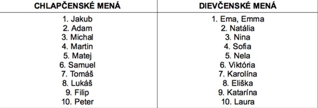 Najčastejšími menami pre deti narodené v tomto roku boli Jakub, Ema a Emma.