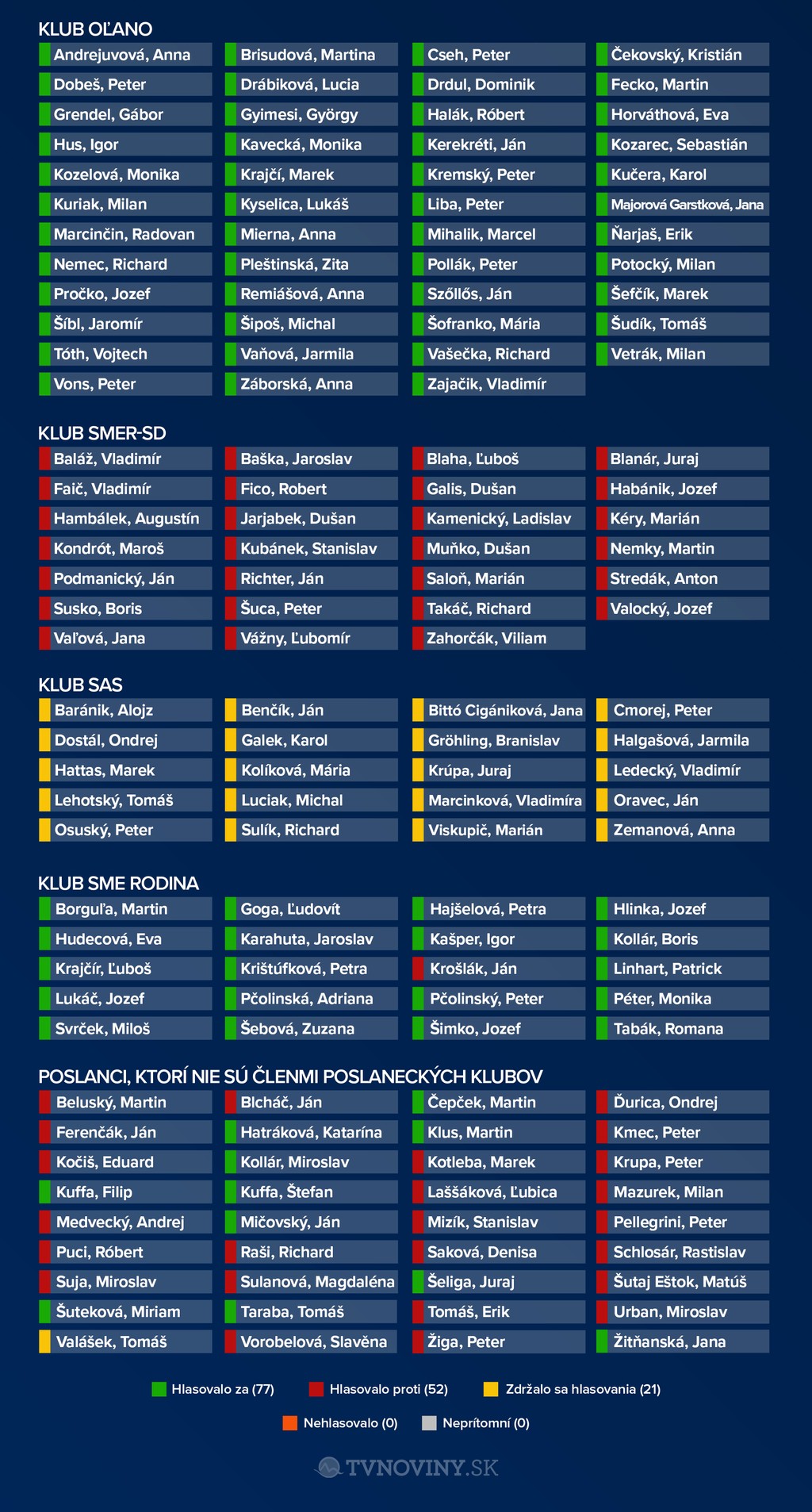 Hlasovania sa zdržali všetci poslanci z klubu SaS. Proti bol celý klub strany Smer či 24 nezaradených poslancov.