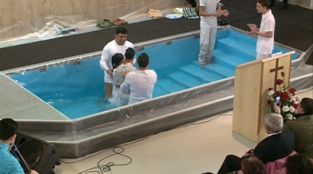 „Je to v podstate pohreb starého života, starého človeka," povedal pastor Igor Laslofi. Krstiteľnicu veľkú ako bazén odkrývajú a napúšťajú vodou iba počas krstu.