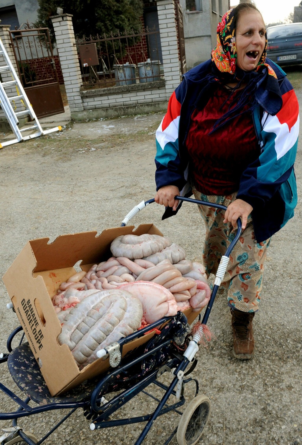 Medzitým ženy vyplachujú črevá, aby sa mali do čoho dať mäsové výrobky, ktoré napokon skončia v údiarni. V kotle sa už varí hlava z prasaťa, lebo okrem kostí sa musí všetko spotrebovať. Pre ochutnávku sa takéto mäso poddávalo so soľou a cesnakom.