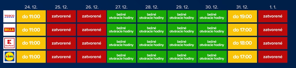 Posledný deň v roku už tradične zatvárajú obchody skôr, ako počas bežných dní. V tomto prípade sa každý z reťazcov vydal svojou cestou. Kým Billa a Lidl zatvoria väčšinu svojich predajní naprieč celým Slovenskom o 17:00 hod., Kaufland zákazníkov obslúži o hodinu dlhšie.