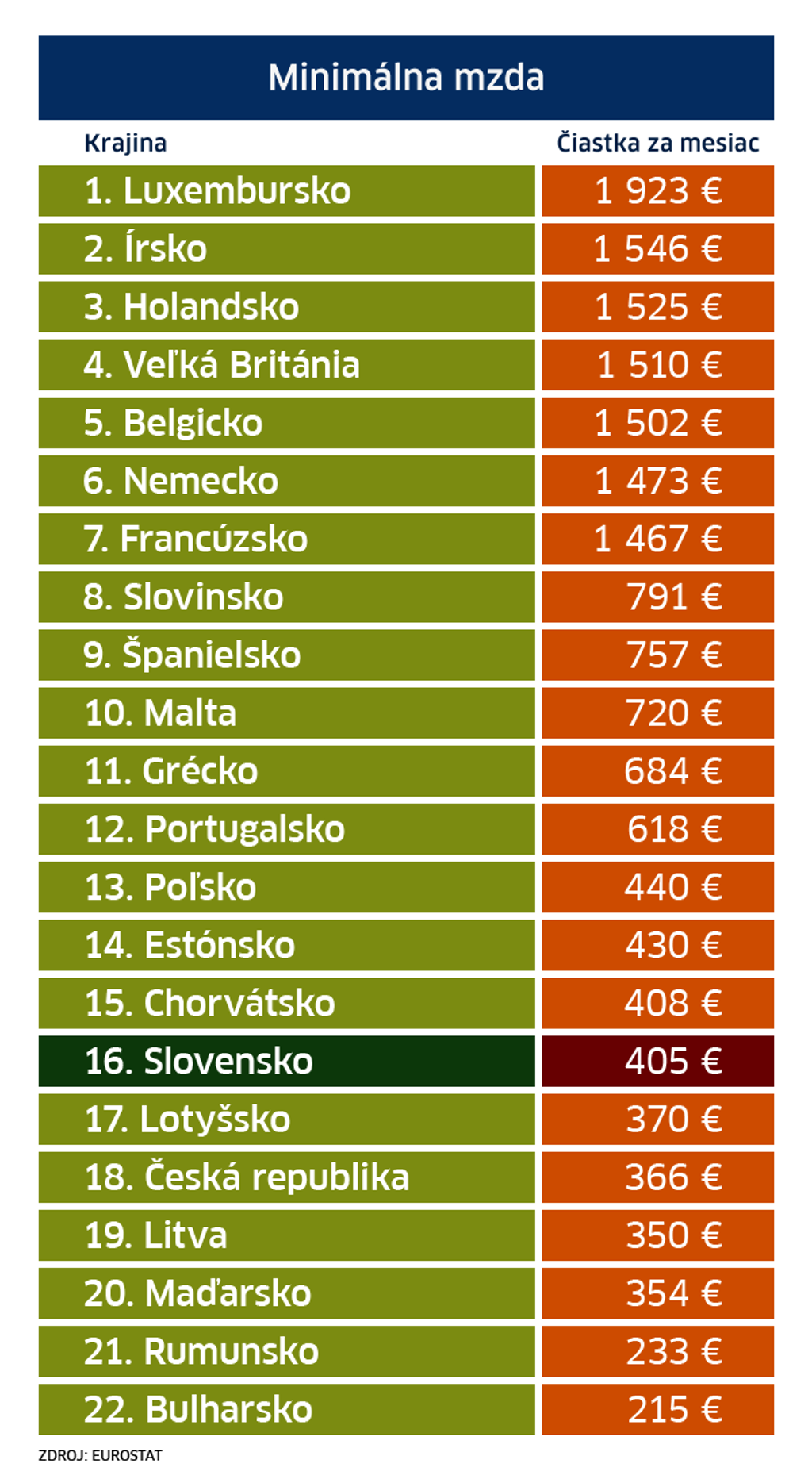 Slovensko sa aj po zvýšení na 405 eur umiestnilo na 16. mieste z 22 štátov. Poľsko skočilo o tri miesta vyššie (440 eur), Maďari si minimálny plat stanovili na 354 a Česi na 366 eur.