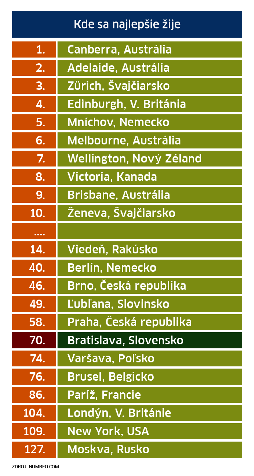 Rešpektovaný portál Numbeo.com vydal rebríček najlepších miest pre život. Najlepšie z neho vyšli austrálske mestá, ktoré obsadili až štyri priečky v TOP 10. Bratislava síce skončila 70., ale predbehla také metropoly ako Paríž, Londýn či New York.