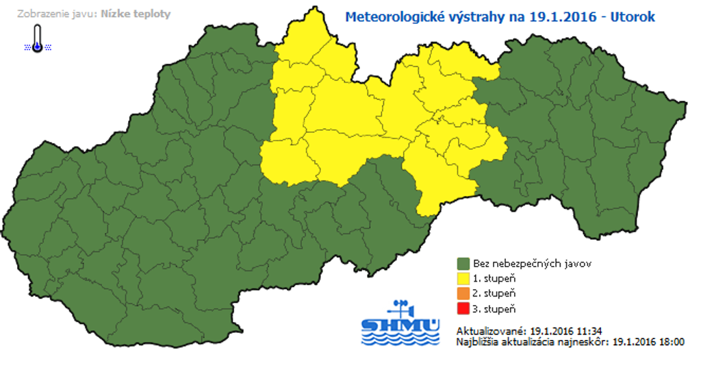 Časť stredného a východného Slovenska môžu zasiahnuť mrazy až do -16 stupňov Celzia. Slovenský hydrometeorologický ústav (SHMÚ) preto pre túto oblasť vydal výstrahu 1. stupňa. Tá potrvá do stredy 20. januára 08.00 h.
