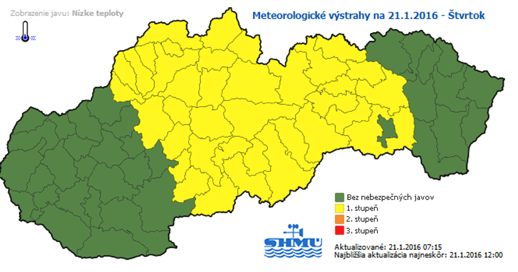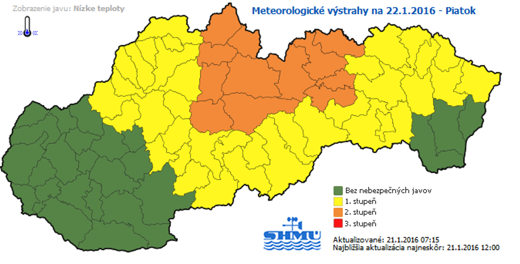 Vlna mrazivého počasia, ktorá zasiahla Slovensko, sa bude prehlbovať. V noci z piatka na sobotu (z 22.1. na 23.1.) môžu teploty na Orave, Liptove, Spiši a Horehroní ojedinele klesnúť na -20 až -22 stupňov Celzia. Upozorňuje na to Slovenský hydrometeorologický ústav (SHMÚ), ktorý v tejto súvislosti vydal výstrahu druhého stupňa.