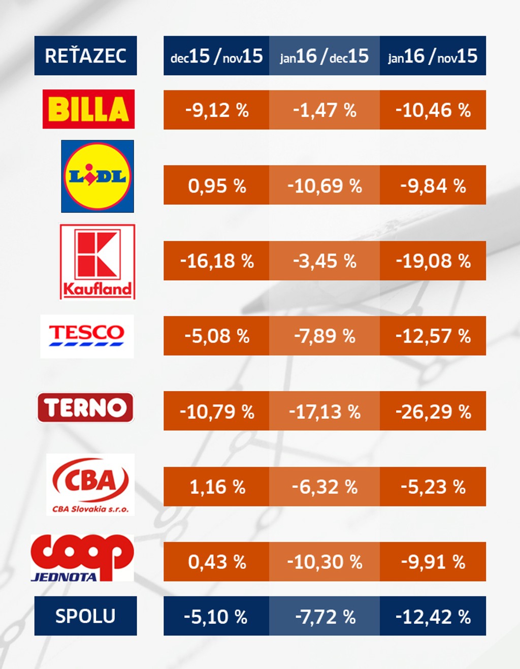 Najlepšie dopadol obchodný reťazec Terno, v ktorom sa ceny v priemere znížili o takmer 27 percent. Druhý skončil Kaufland s 19-percentných poklesom. Na konci rebríčka sa ocitla CBA (5,23). Úradníci nevyhodnotili Carrefour, keďže nemali dostatok údajov na vyhodnotenie.