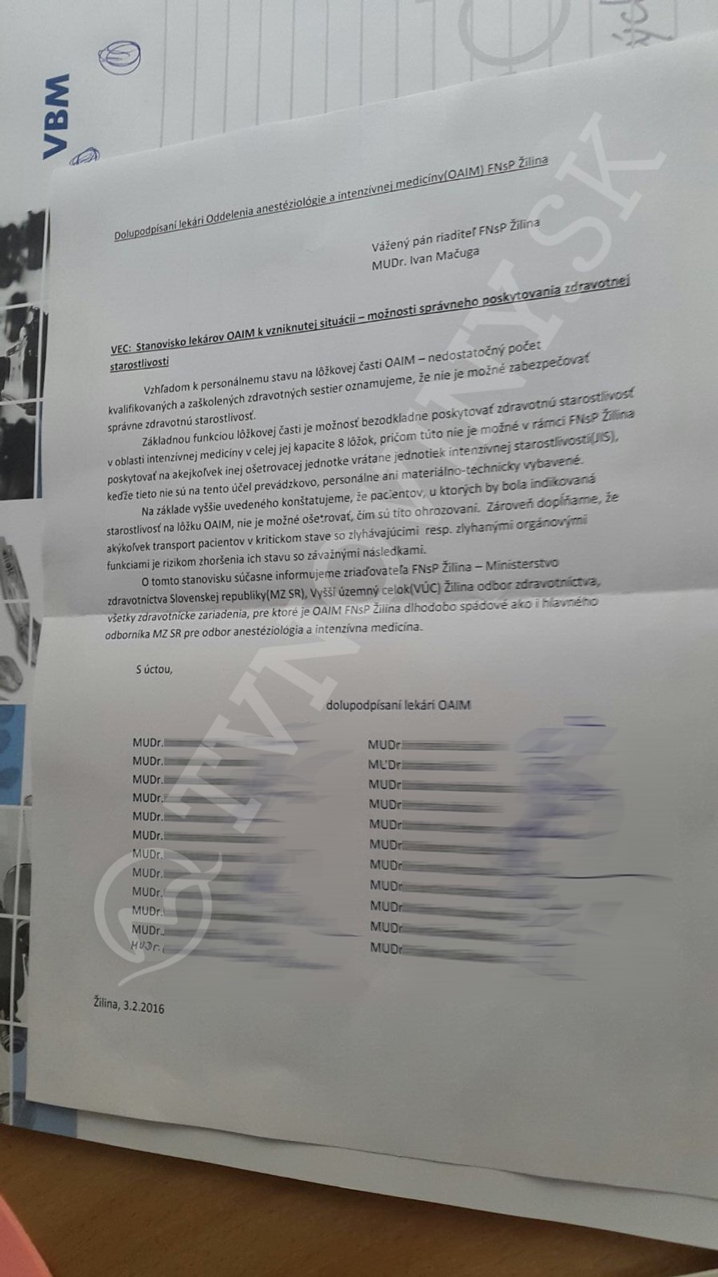 V stredu (3.2.) však 23 lekárov, čo je drvivá väčšina z oddelenia anestéziológie a intenzívnej medicíny (OAIM), poslalo list riaditeľovi nemocnice Ivanovi Mačugovi a ministerstvu zdravotníctva, v ktorom píšu, že toto oddelenie nedokáže zabezpečiť správnu zdravotnú starostlivosť.