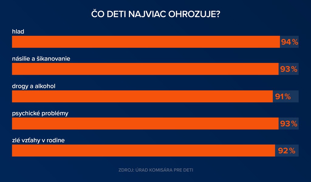 Respondenti odpovedali aj na to, čo podľa nich deti najviac ohrozuje. Otázka nemierila priamo na ich osobné životy, ale na všeobecné trendy.