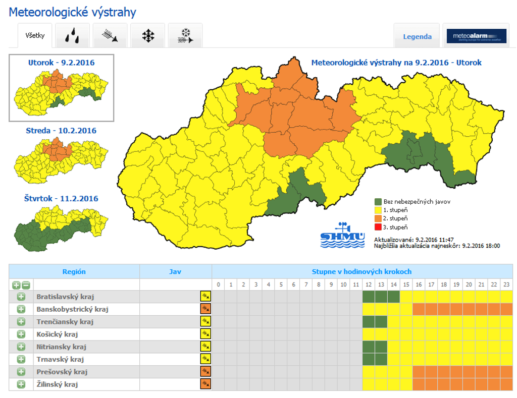 SHMÚ dnes tiež upozorňuje na silný vietor na celom Slovensku. Vo vysokohorskom teréne nad pásmom lesa sa miestami očakáva výskyt vetra s priemernou rýchlosťou až viac ako 80 km/h. Ten môže v nárazoch dosiahnuť rýchlosť 120 až 140 km/h.