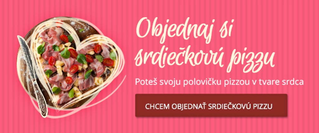 Internetový portál pre objednávanie jedla online - Bistro.sk pripravil počas valentínskeho víkendu akciu. Zákazníci si môžu vo svojich obľúbených reštauráciách vo vybraných mestách objednať pre seba a svoju polovičku srdiečkovú pizzu.