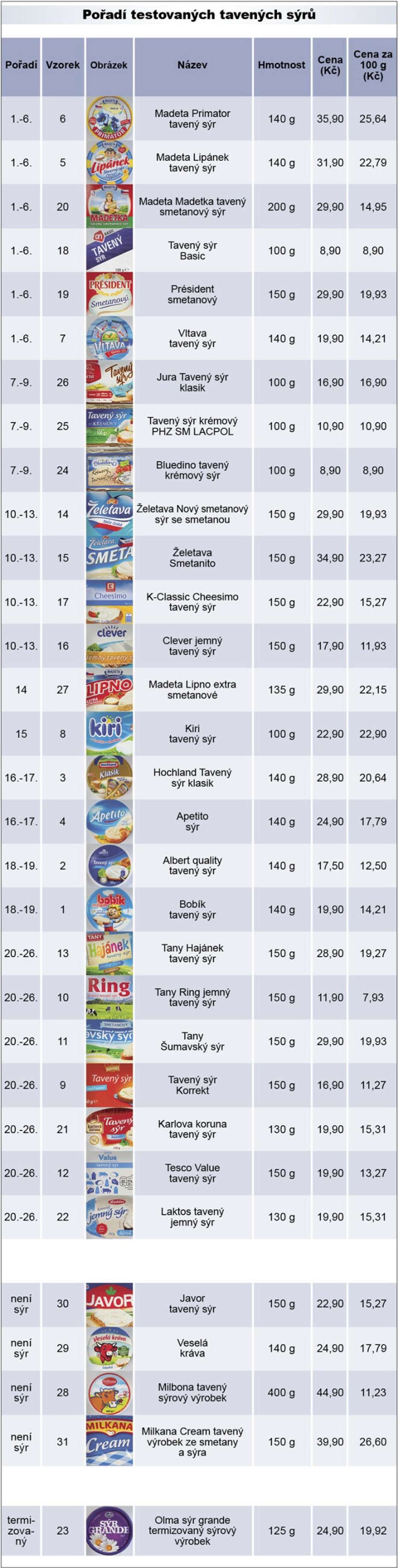 O tavených syroch existujú rôzne diskusie, či sú zdravé. Tie kvalitnejšie, ktoré sa vyrábajú z ozajstného syra, si ale svoje miesto v kuchyni určite zaslúžia. Redakcia tn.cz kúpila v supermarketoch 31 vzoriek, ktoré následne otestoval kulinár Petr Stupka. Po bližšom preskúmaní obalov prišli na to, že štyri zakúpené vzorky nie sú syr, ale takzvané tavené mliečne výrobky, a preto ich hneď vyradili do samostatnej skupiny.