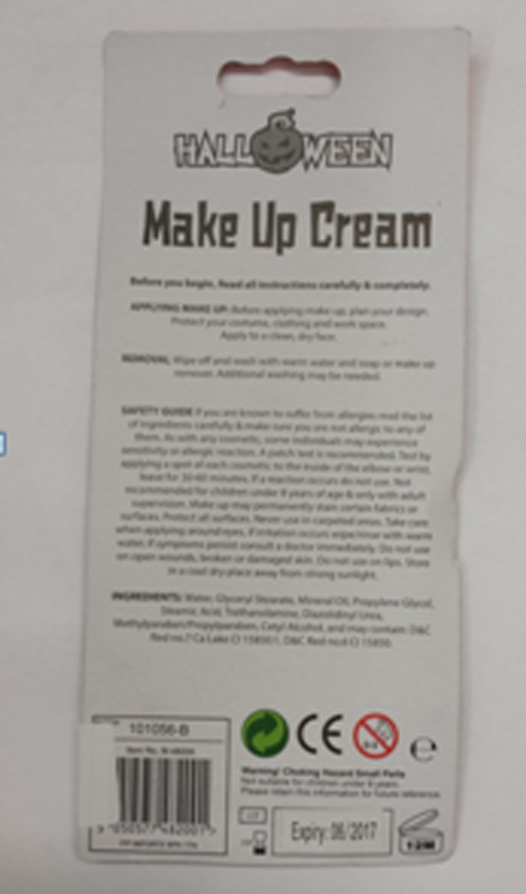 Pozor si dávajte aj na krémový make-up Halloween Make up cream pôvodom z Číny. Kozmetika sa nachádza v plastovej tube zabalenej do plastového obalu. Vo výrobku bol zistený prekročený počet mikroorganizmov.