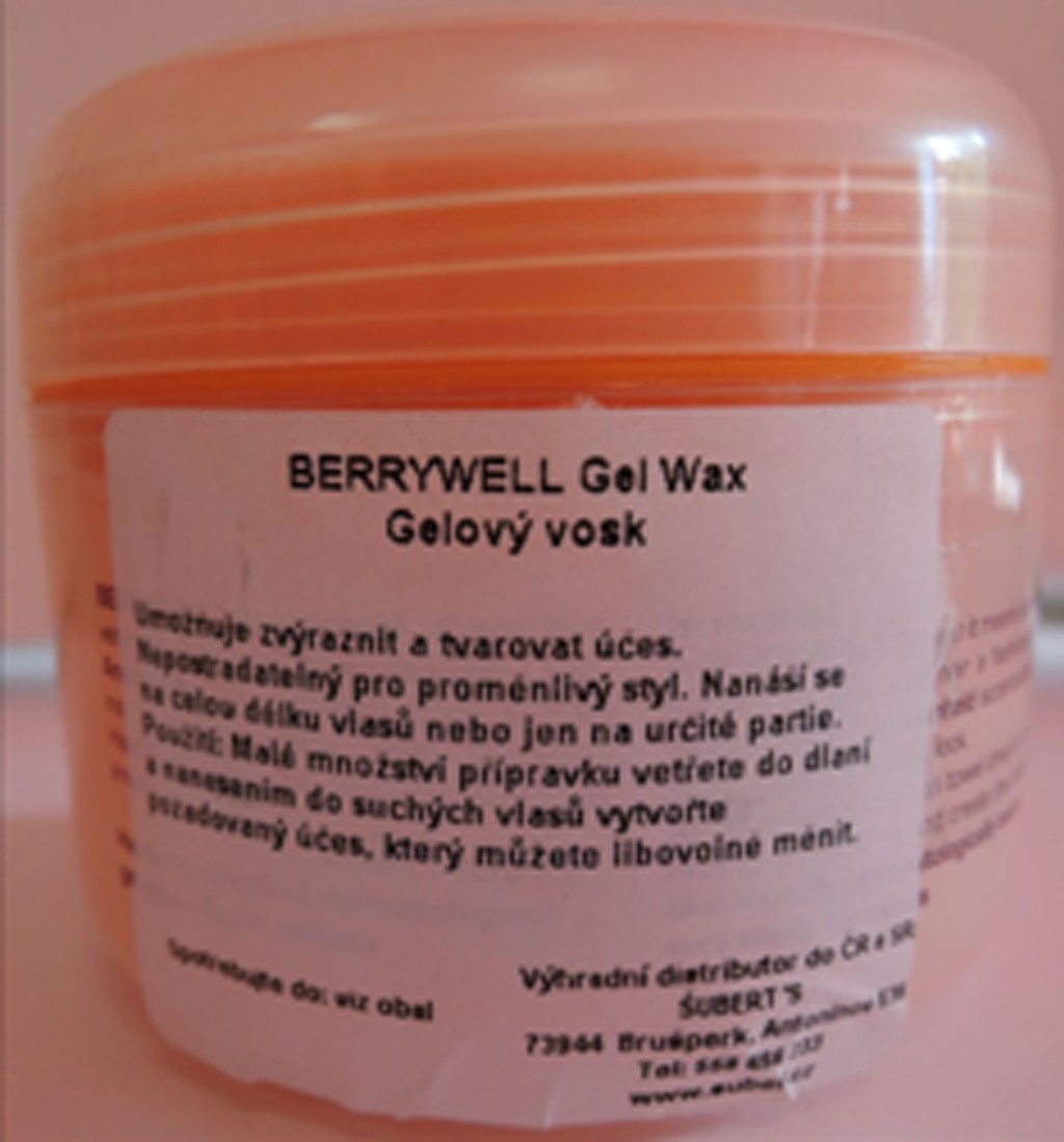 Na snímke je gélový vosk Berrywell Professional haircare pôvodom z Nemecka. Výrobok sa nachádza v 51-ml plastovom tégliku oranžovej farby. Vo vosku sa nachádza látka isobutylparaben.