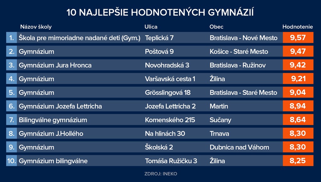 V prípade gymnázií sa na prvé miesto dostala Škola pre mimoriadne nadané deti z Teplickej ulice v Bratislave (vlani sa v prvej desiatke neumiestnila). Druhé miesto si obhájilo Gymnázium na Poštovej 9 v Košiciach a prvú trojicu uzatvára bratislavské Gymnázium Jura Hronca na Novohradskej 3 (minulý rok prvé miesto).