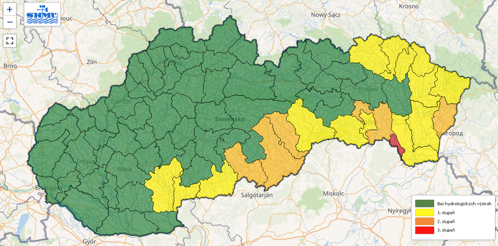 Najvyšší, tretí stupeň výstrahy pred povodňou aktuálne platí v okrese Trebišov pre tok Roňava. Druhý stupeň výstrahy vyhlásil SHMÚ pre okresy Lučenec, Rimavská Sobota, Revúca, Košice-okolie (Hornád) a Sobrance.