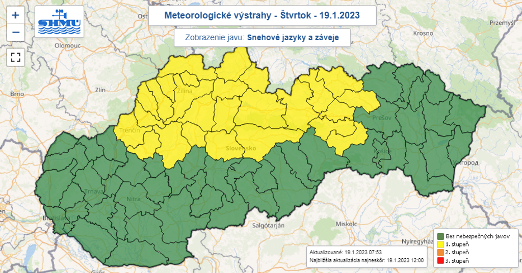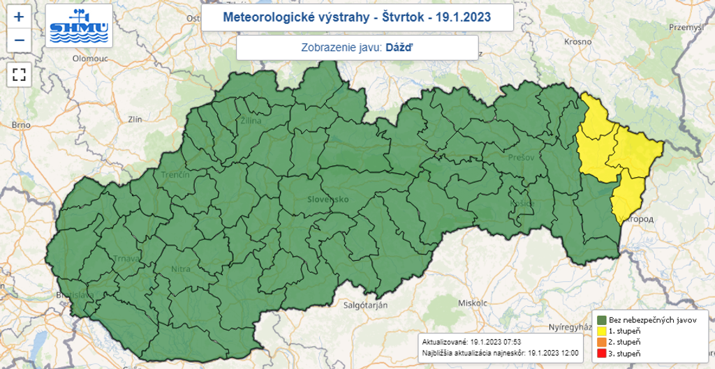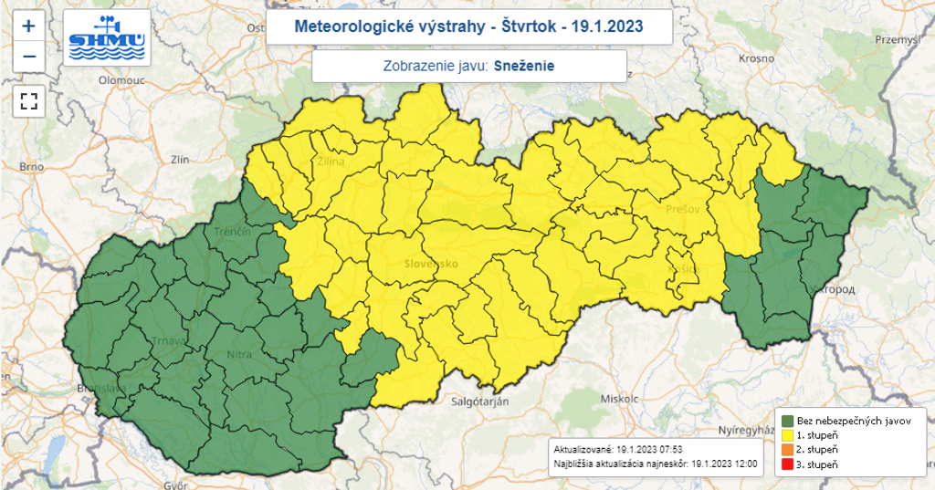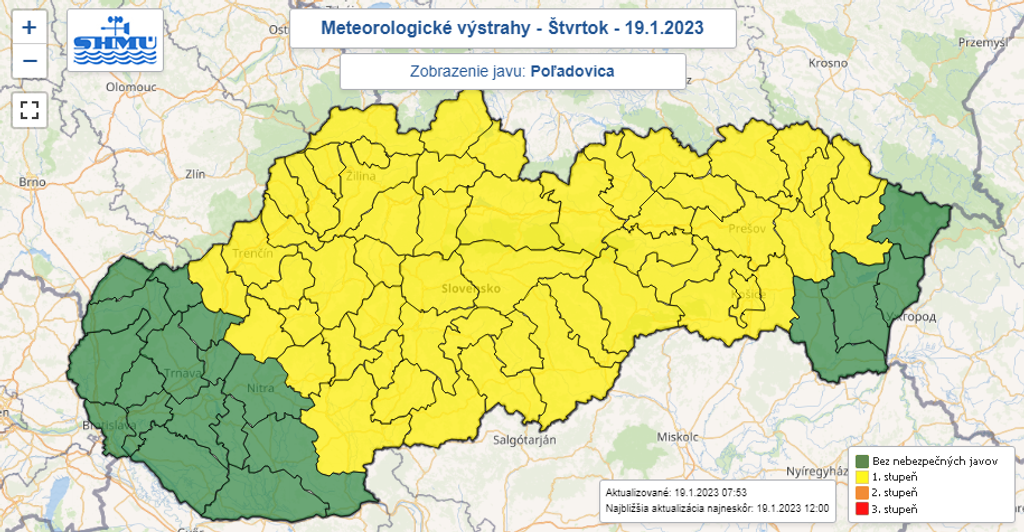 Slovensko môže vo štvrtok potrápiť miestami sneženie, dážď, poľadovica i snehové jazyky a záveje. Na juhu a východe Slovenska hrozia povodne z trvalého dažďa. Slovenský hydrometeorologický ústav (SHMÚ) preto vydal výstrahy 1. až 3. stupňa.