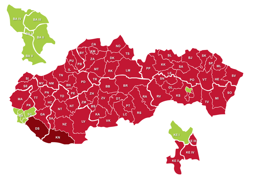 Volebné výsledky opäť zafarbili mapu Slovenska na červeno. Najsilnejšou stranou zostal Smer-SD, ktorý zvíťazil v 70 zo 79 slovenských okresov. Zvyšných deväť si rozdelilo SaS s SMK. Liberáli ovládli všetkých päť bratislavský okresov, senecký okres a jeden z košických okresov, konkrétne Košice I. Stranu SMK volilo najviac obyvateľov okresov Dunajská Streda a Komárno.