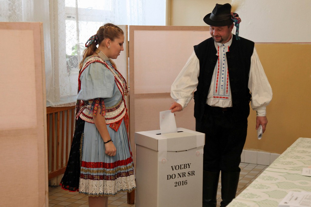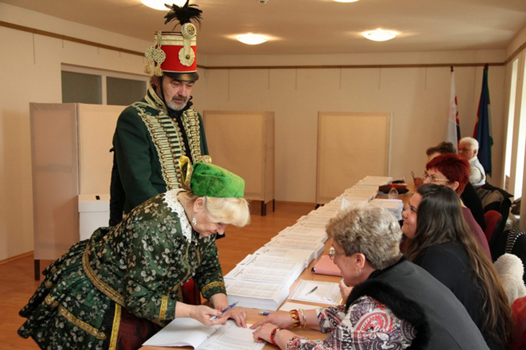16.42 - Členka folklórneho spevokolu Neväzda Gizely Samsonovej a člen Hornozemského husárskeho oddielu, ktorého veliteľom je Ferenc Sámson sa podpisujú pri preberaní hlasovacích lístkov vo volebnej miestnosti počas volieb do Národnej rady SR v obci Iža okres Komárno.