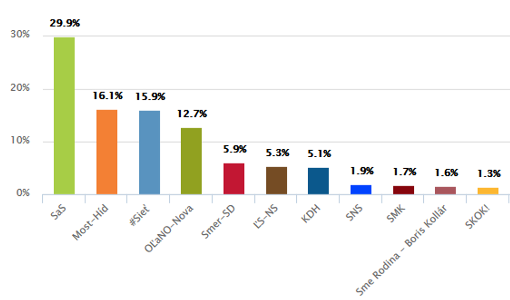 Voľby by jednoznačne vyhrala Sloboda a solidarita s takmer 30 percentami. Za liberálmi nasledujú strany Most-Híd a #Sieť, ktoré volilo približne 16 percent ľudí. Poslednou výraznou stranou by sa stalo hnutie OĽaNO-NOVA (12,7%).