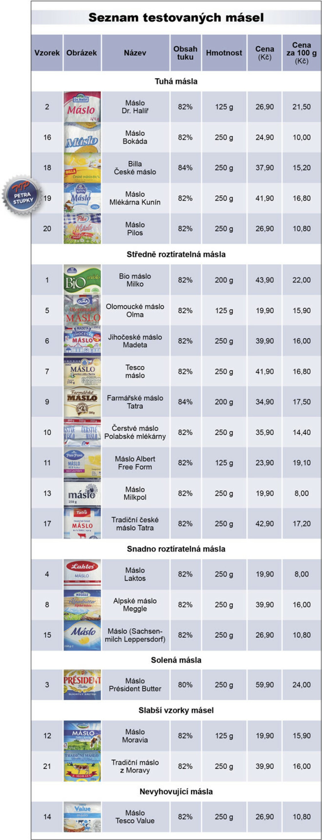 "Nešlo to ako po masle," vyhlasuje Petr Stupka symbolicky krátko po testovaní. Avšak s výsledkami testu je spokojný. Väčšinu výrobkov hodnotí ako veľmi dobré. Len jedinú vzorku by Stupka nedoporučoval, a to vzorku číslo 14, teda maslo Tesco Value: "Tam je akási pachuť a zvláštne neprirodzená príchuť, takže toto mi vyložene nechutilo," hodnotí najslabší článok testu kulinár.