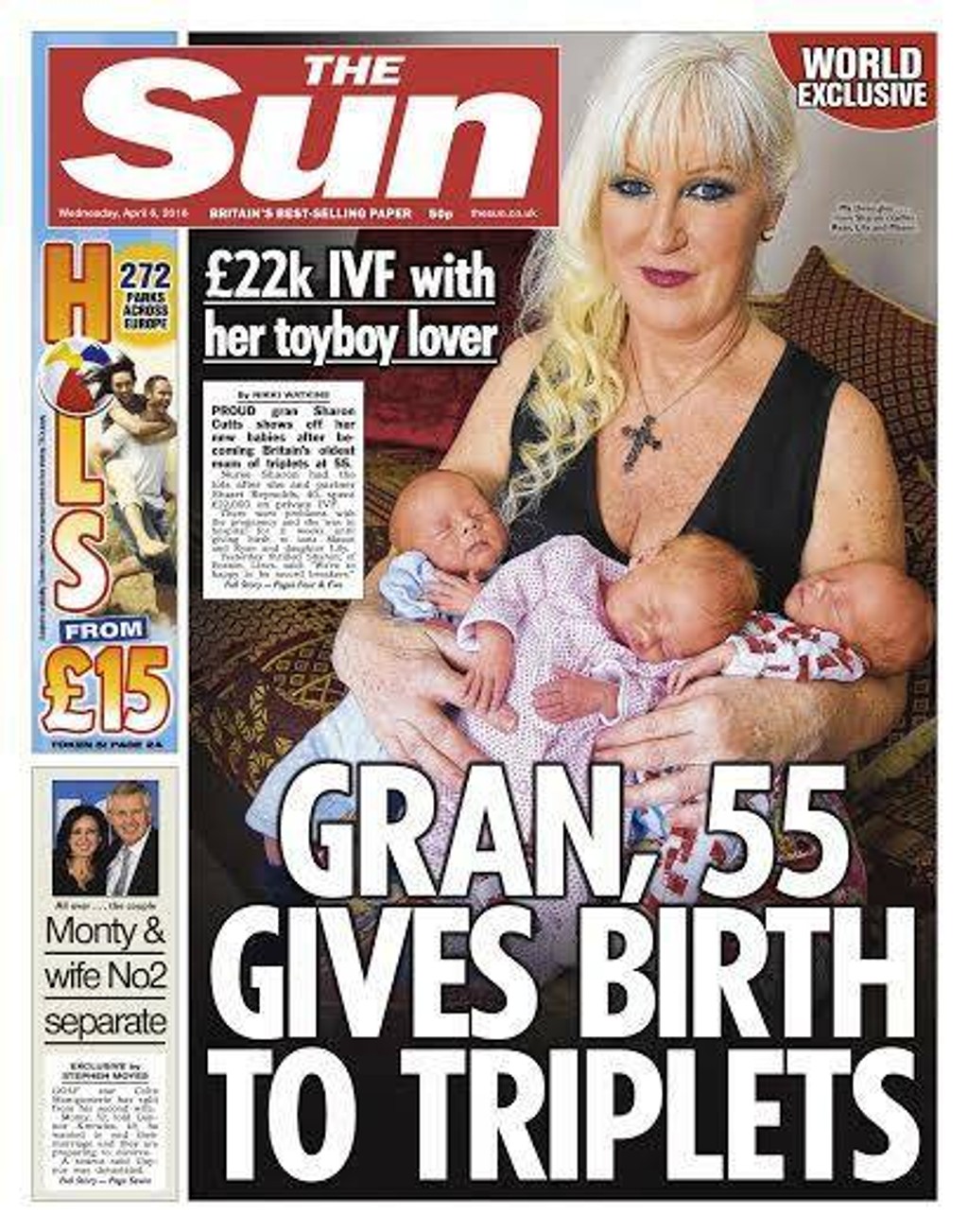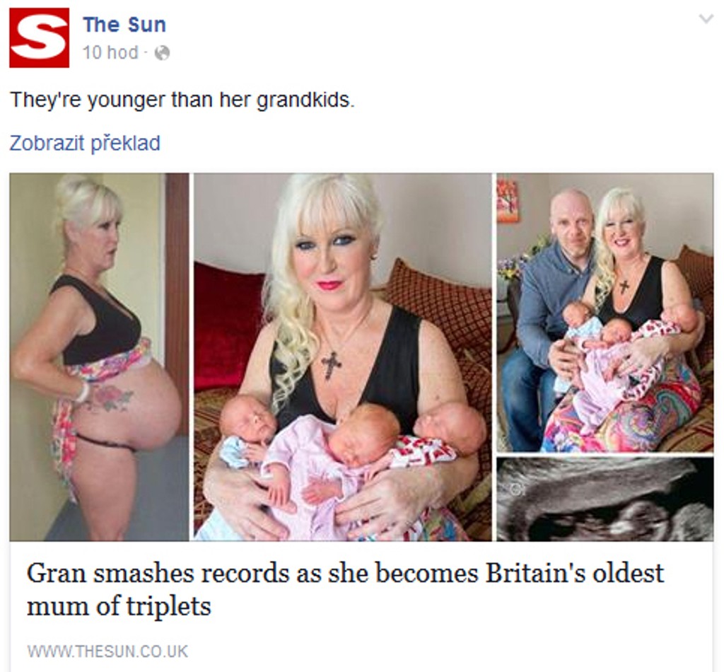 Sharon Cutts sa stala najstaršou mamičkou v Británii. Na svet priviedla trojčatá, a to má 55 rokov. Žena však šokovala svojimi vyhláseniami. Mnohé mladšie ženy po celom svete majú problém otehotnieť a túžia po bábätkách. Keď sa tak už stane, zaujíma ich len to, aby priviedli na svet zdravé deti. Píše The Sun.