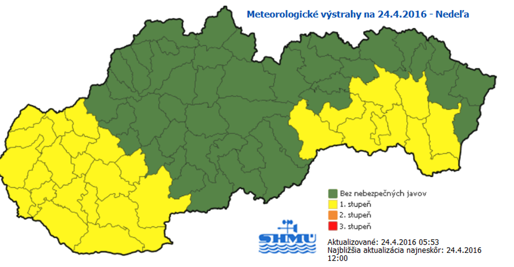 Na východe pod prvý stupeň výstrahy spadajú okresy Gelnica, Košice, Košice-okolie, Michalovce, Rožňava, Trebišov, Prešov a Vranou nad Topľou.