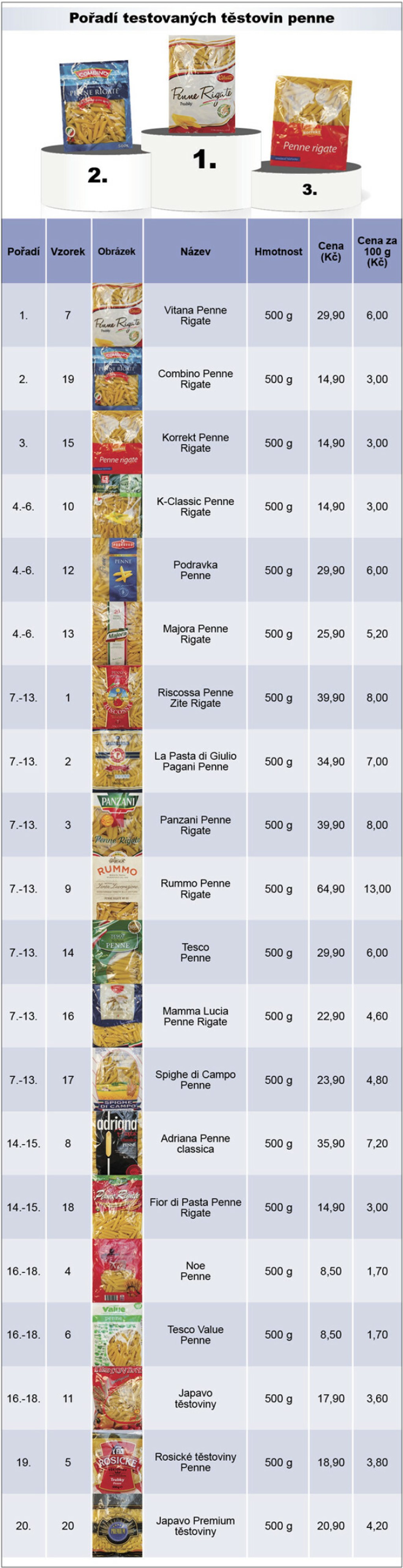 Tesne pod stupňami víťazov, na zdieľanom 4. až 6. mieste, skončili nakoniec cestoviny K-Classic z Kauflandu, penne od Podravky a penne značky Majora. "Keď ich kúpite, tak kúpite dobre a nemusíte sa vôbec báť, že urobíte zlé jedlo," chváli je Stupka.