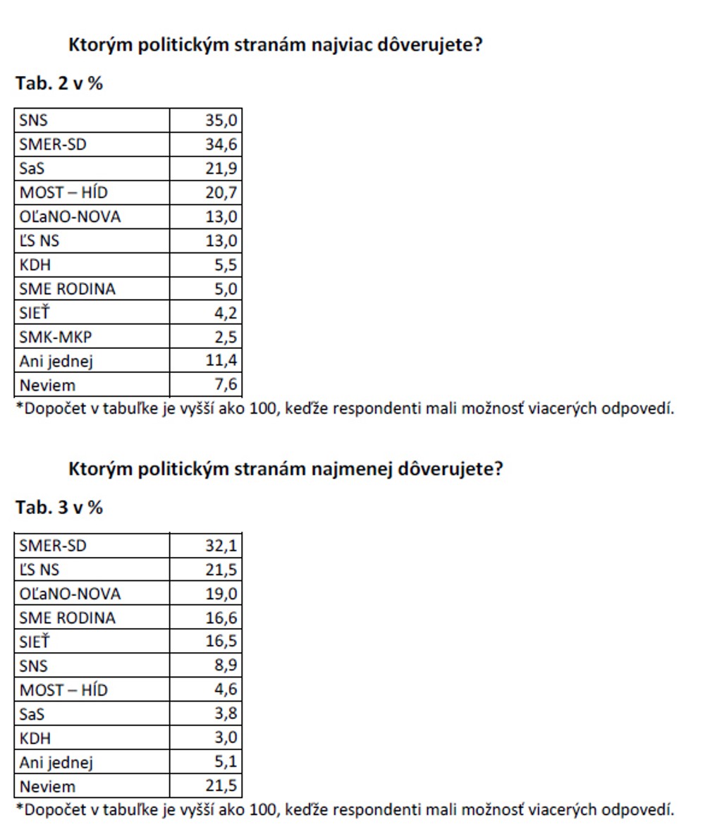 Ako ďalej tvnoviny.sk informoval Ján Baránek, v prieskume dostali respondenti aj dve otázky týkajúce a obľúbenosti politických strán. Najdôveryhodnejšou je SNS a Smer-SD, ktorý je zároveň najnedôveryhodnejšou stranou spoločne s Kotlebovcami.