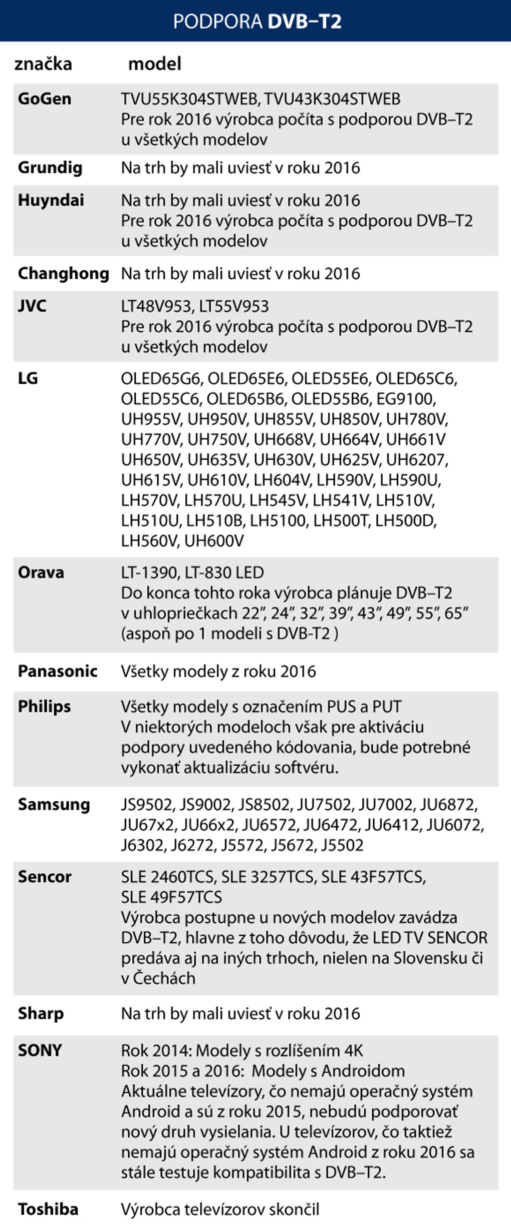 Oslovili sme najznámejšie značky televízorov, ktoré ponúkajú svoje produkty na slovenskom trhu. Pozrite si, ktoré modely nový druh vysielania podporujú.