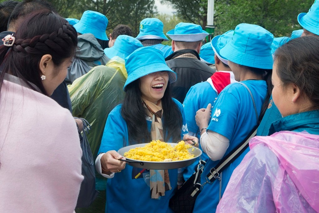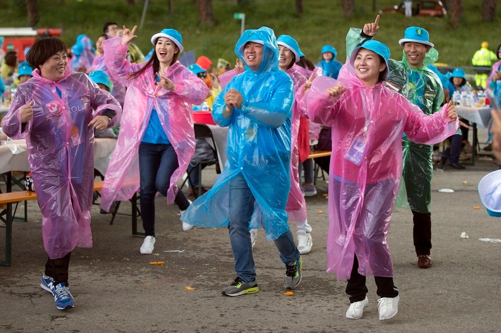 Usmievajúce sa davy pracovníkov sedeli za dlhým radom piknikových stolov v parku na brehu rieky a taniere s horami paelly zapíjali sangriou.