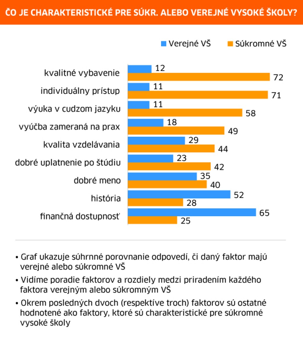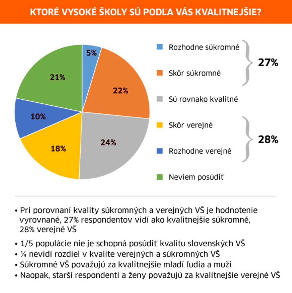 Súkromné vysoké školy považuje za kvalitnejšie 27 percent ľudí a takmer rovnako - 28 percent ľudí sa v tomto smere prikláňa ku kvalitnejšiemu vzdelávaniu na verejných vysokých školách.