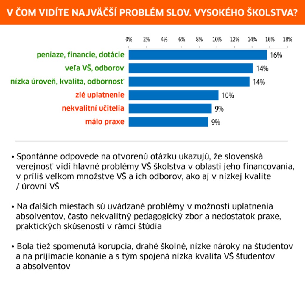 Z prieskumu ďalej vyplynulo, že slovenská verejnosť vidí hlavné problémy vysokého školstva v oblasti jeho financovania (16 %), ale aj v nízkej kvalite vzdelávacích inštitúcií (14 %).