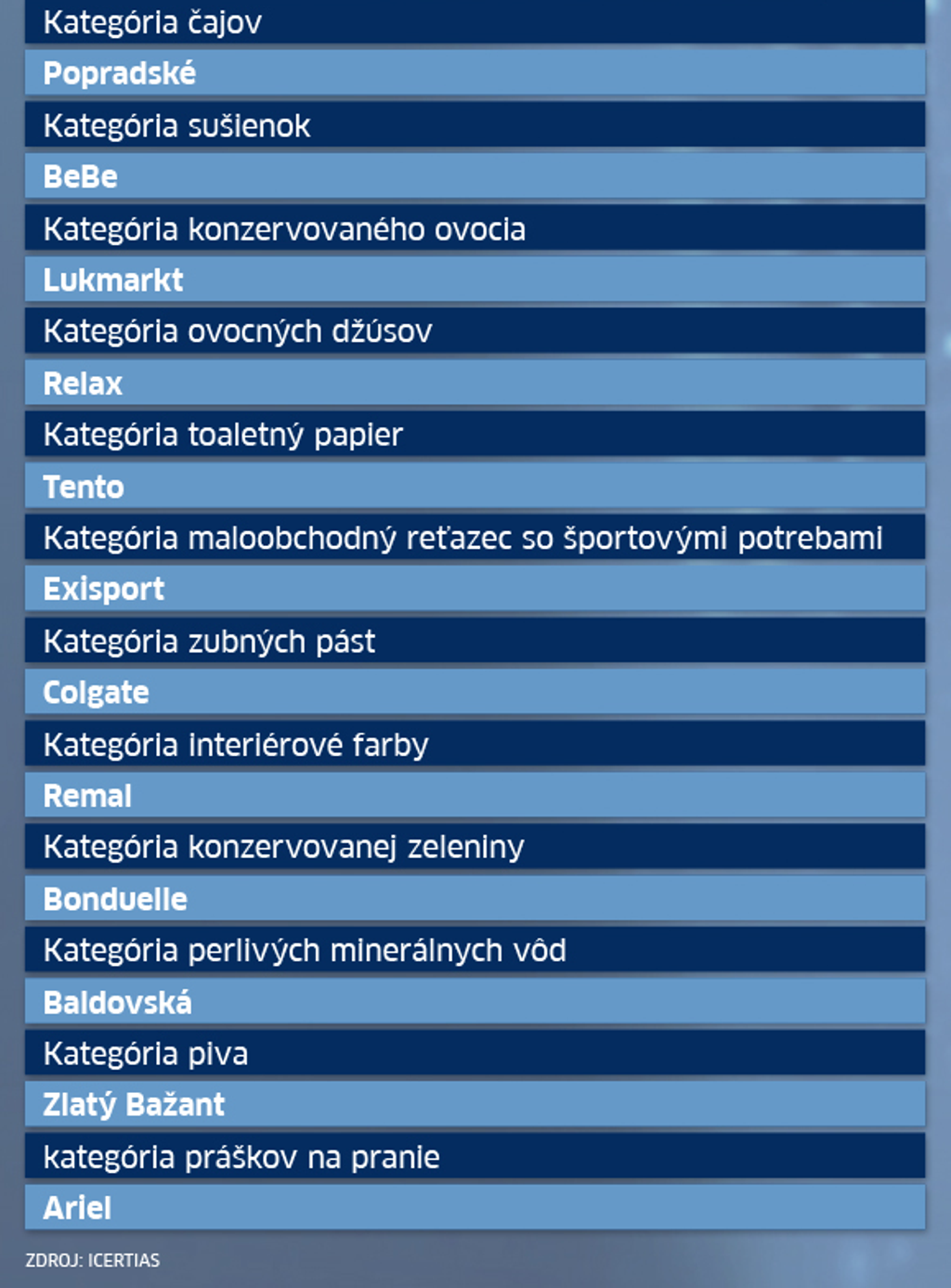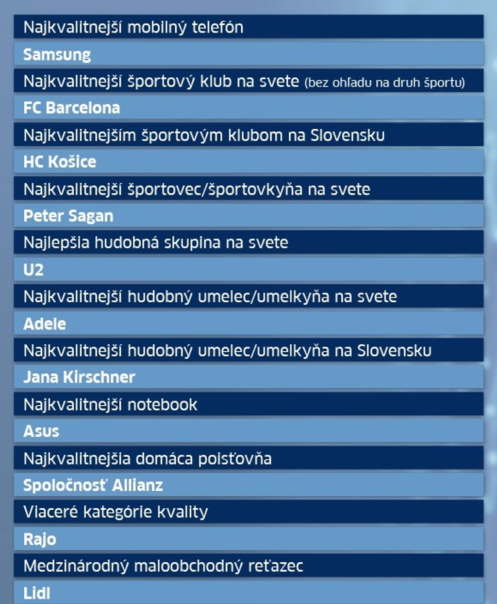 Slováci ukázali prstom na najkvalitnejšie značky, ktoré boli rozdelené do viacerých kategórií. V prieskume si respondenti nemuseli vyberať len klasické produkty, ale aj obľúbených športovcov či spevákov.