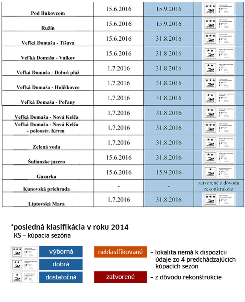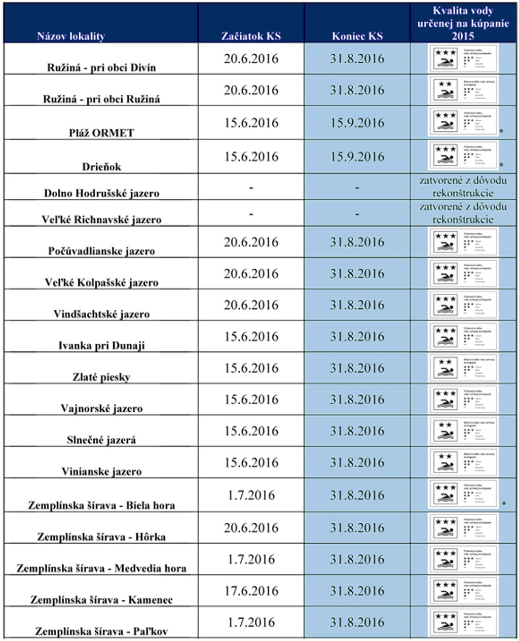 Úrad pre verejné zdravotníctvo aj tento rok bude pravidelne monitorovať kvalitu vody na kúpaliskách a na 30 prírodných lokalitách, ktoré sú určené na kúpanie. Tento rok vypadli zo zoznamu Hodrušské jazero, Veľké Richňavské jazero a Kunovská priehrada. Dôvodom je rekonštrukcia či znížená resp. vypustená hladina vody.
