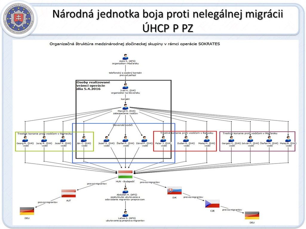 Piateho apríla tohto roka vykonala Národná jednotka boja proti nelegálnej migrácii akciu s krycím názvom Sokrates. Jej cieľom bolo rozbitie zločineckej skupiny prevádzačov, ktorú tvorilo 19 páchateľov. Viedol ich Afgánec Azimi S. žijúci v Maďarsku.