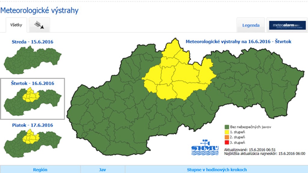 Vietor môže v nárazoch krátkodobo dosiahnuť rýchlosť 90 až 115 kilometrov za hodinu, a to od štvrtka (16.6.) od 16.00 h do soboty (18.6.) do 00.00 h. Slovenský hydrometeorologický ústav (SHMÚ) nevylučuje vznik menších škôd. Rýchlosť vetra je však v danom ročnom období bežná.