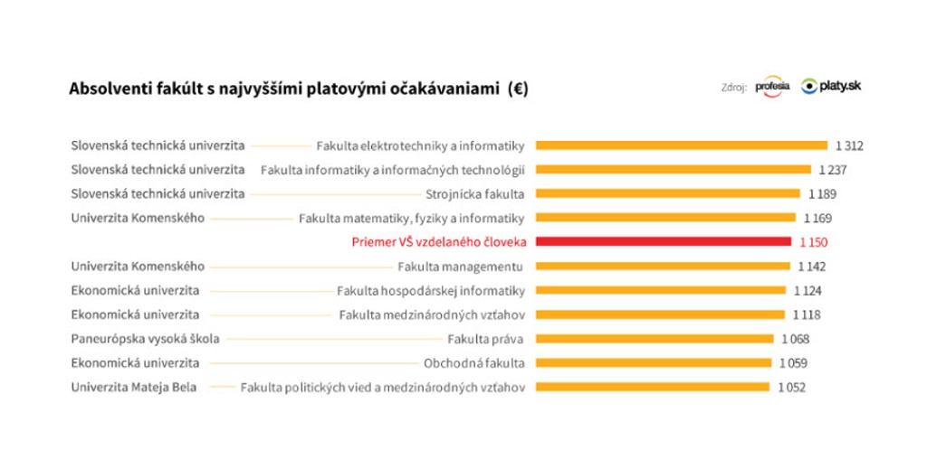 Najvyššie platové očakávania majú jednoznačne absolventi Slovenskej technickej univerzity, konkrétne bývalí študenti Fakulty elektrotechniky a informatiky, ktorí by chceli zarábať 1 312 eur mesačne v hrubom. Hneď za nimi by sa na druhej a tretej priečke v rebríčku umiestnili absolventi Fakulty informatiky a informačných technológií a Strojníckej fakulty. Podľa portálu Platy.sk tvorí priemerný plat vysokoškolsky vzdelaného človeka 1 150 eur. Očakávania absolventov s technickým zameraním sú teda nadpriemerné. Súvisí to aj s tým, že na pracovnom trhu je nedostatok práve technicky orientovaných ľudí, a preto je pre absolventov s týmto zameraním jednoduchšie uplatniť sa.