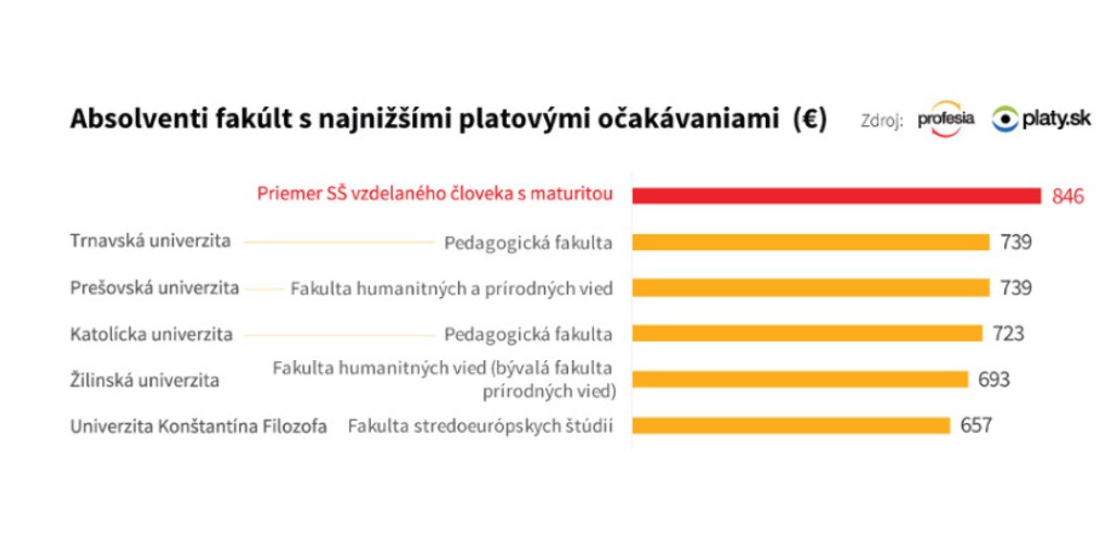 Najnižšie platové očakávania majú absolventi fakúlt humanitného a pedagogického zamerania. Bývalí študenti Fakulty stredoeurópskych štúdií na Univerzite Konštantína Filozofa v políčku „Očakávaný plat" uviedli priemerne sumu 657 eur v hrubom. Pre porovnanie, priemerná hrubá mesačná mzda vysokoškolsky vzdelaného človeka je podľa platového portálu Platy.sk 1 150 eur v hrubom, v prípade stredoškolsky vzdelaného človeka je to 846 eur v hrubom.