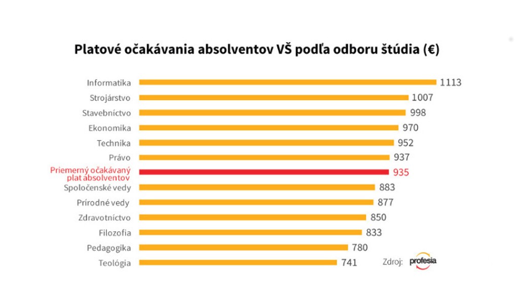 Svoju hodnotu na pracovnom trhu si najvyššie cenia absolventi odboru informatika. Na svojej výplatnej páske by radi videli v priemere 1 113 eur v hrubom, čo tvorí rozdiel 178 eur voči priemeru. Očakávania nad priemerom majú aj absolventi strojárstva, stavebníctva, ekonomiky či práva. Naopak, najmenšie očakávania majú absolventi pedagogiky a teológie. Práve tí by sa uspokojili s nástupným platom pod úrovňou 800 eur v hrubom.