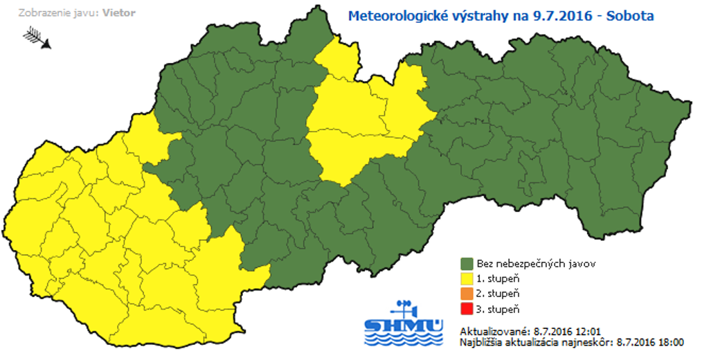 Výstraha prvého stupňa platí od polnoci z piatka na sobotu (9.7.) pre Banskobystrický a Žilinský kraj. V sobotu od ôsmej hodiny rána tiež pre Bratislavský, Nitriansky a Trnavský kraj. Uvádza to Slovenský hydrometeorologický ústav (SHMÚ) na svojej webovej stránke.