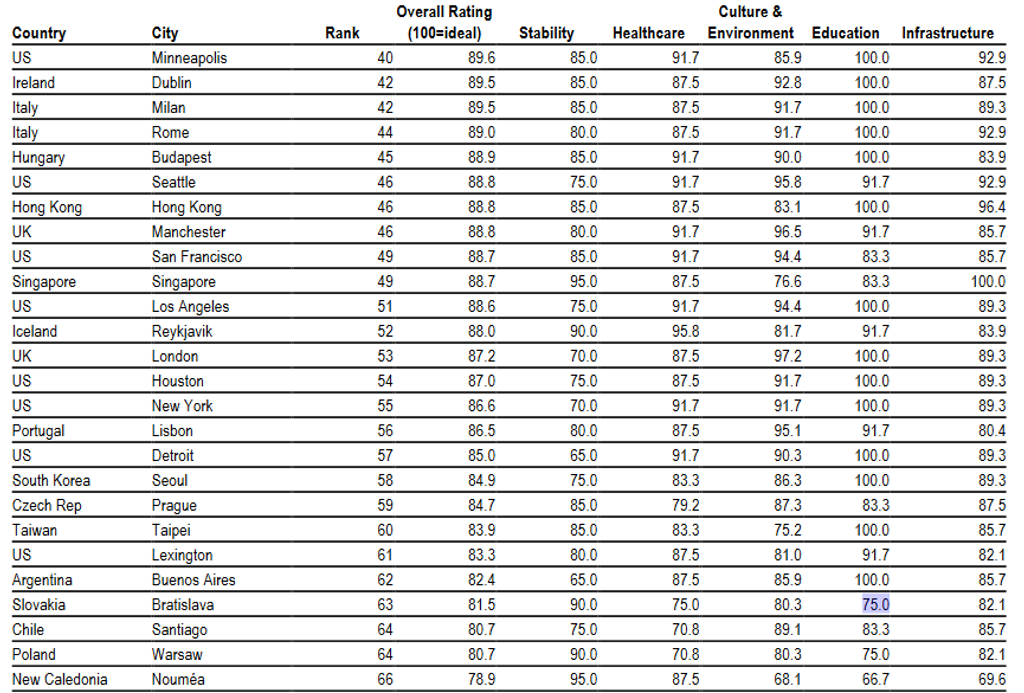 Zaostala najmä vďaka slabšej zdravotnej starostlivosti a kvalitou vzdelania. Pre porovnanie, Praha je na 59. mieste.