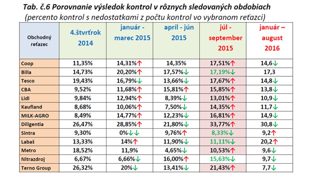 Čo sa týka nedostatkov v rámci obchodných reťazcov, najvyššie percento porušenia dosiahol obchodný reťazec Diligentia R.C. na úrovni 30,8 %, za ním nasledoval Labaš s 20,2 % pochybení, potom Billa s 17,3 % nedostatkov a následne Milk - Agro so 14,9 % či Tesco s 14,8 % alebo Coop Jednota s 14,6 %.