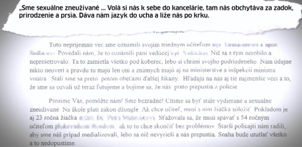 A tu sú ďalšie úryvky z listu: „Na škole platí zákon džungle. Ak chce učiteľ, musí s ním žiačka súložiť." „Nám údajne nikto neuverí a pravdu tu majú len oni a známych majú na ministerstve a inšpekcii ministra vnútra." Preto nikomu neveria. Obsah listu postavil zo stoličky aj generálneho prokurátora. "Generálny prokurátor sa okamžite začal prípadu venovať, prešetrujeme to," hovorí Andrea Predajňová, hovorkyňa generálnej prokuratúry.